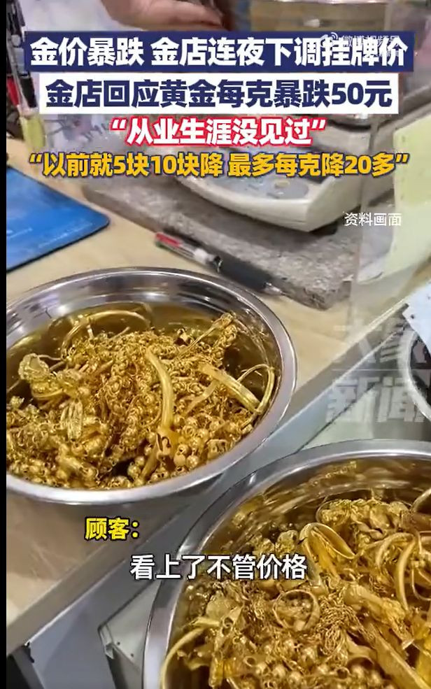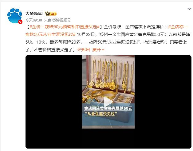 据大象新闻,10月22日,郑州一金店回应黄金每克跌50元:以前都是降5块、10块,最多每克降20多,一夜降50元“从业生涯没见过”。有消费者称,只要看上了,不管价格直接买走了。