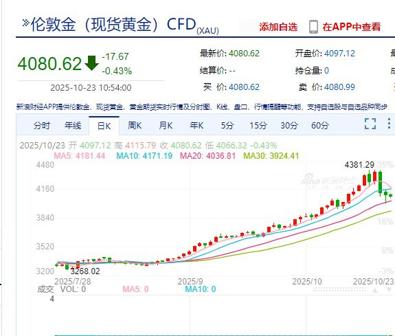 截至10月23日发稿,现货黄金报4080.62美元/盎司,跌0.43%。